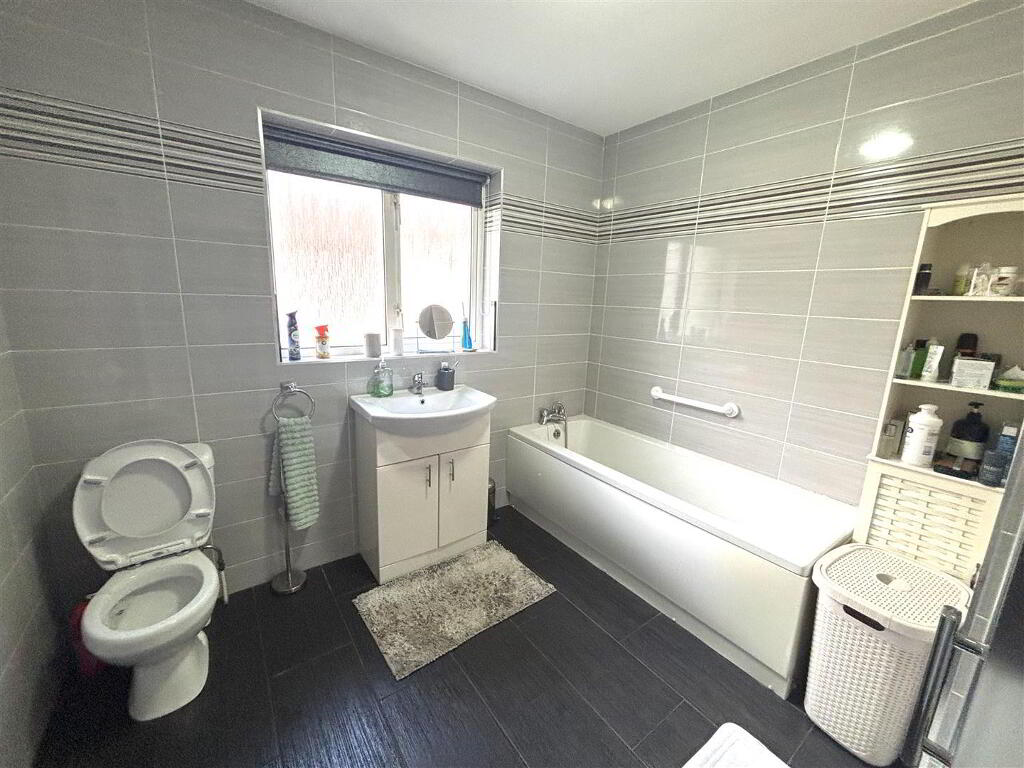 Refurbished bathroom featuring fully tiled walls, a white bath with shower attachment, wall-mounted wash hand basin with vanity unit, fully tiled shower cubicle with electric shower, low flush W.C. and tiled flooring.