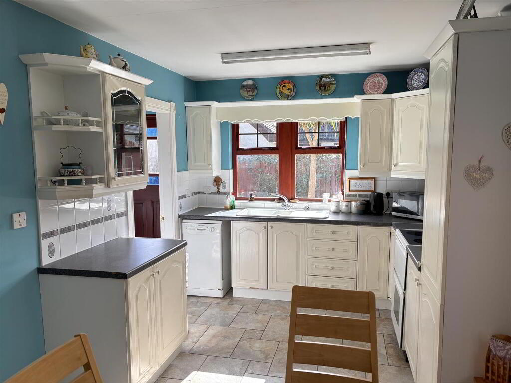 with a range of cream eye and low level units, larder cupboard, matching worktop, tiled around units, composite sink unit, pelmet over windows, cooker, extractor fan, dishwasher, feature glass display unit, strip lighting, tiled flooring.