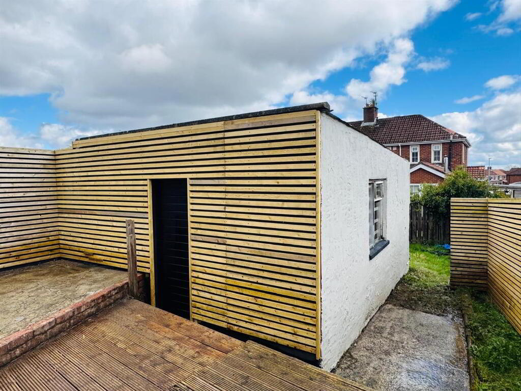Lawn to front bordered by wall and gate. Garden to rear with decked and paved patio area. Outside tap.