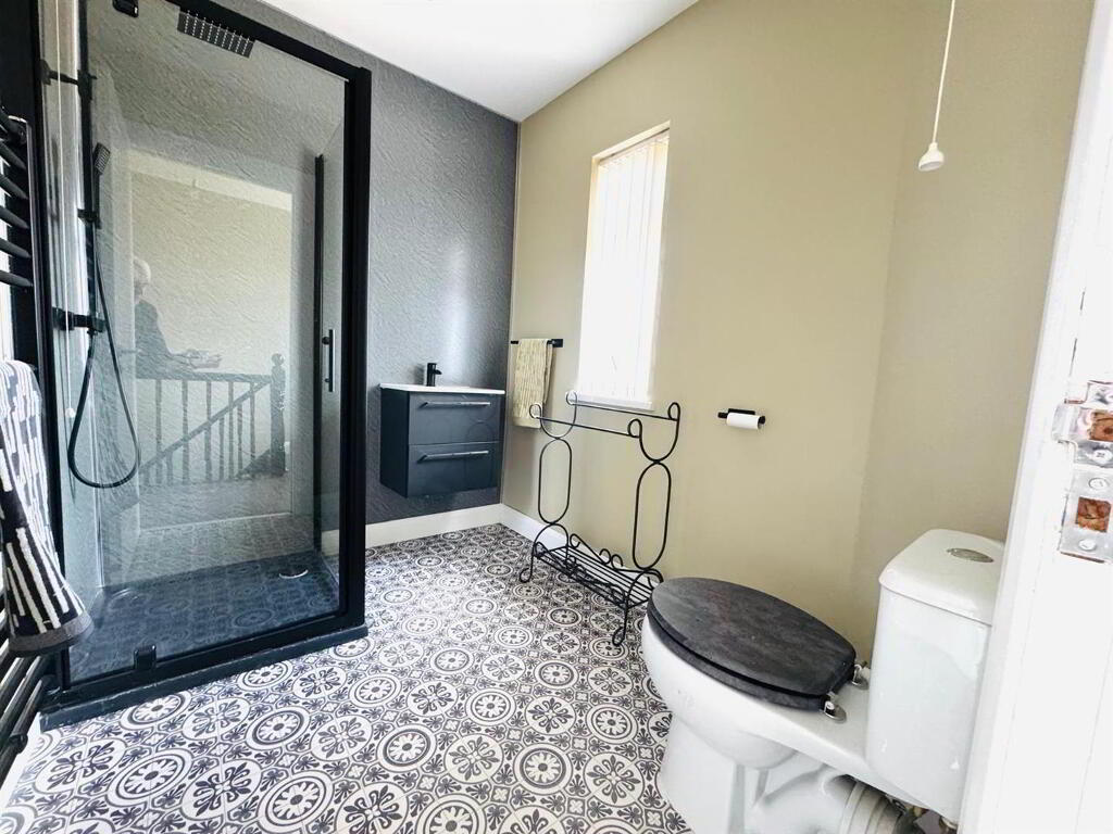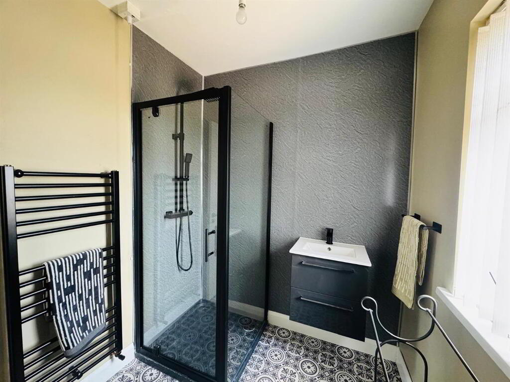 Comprising walk in electric shower, whb with mixer taps and tiling around, wc, wall radiator.