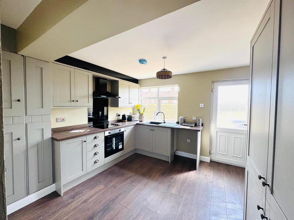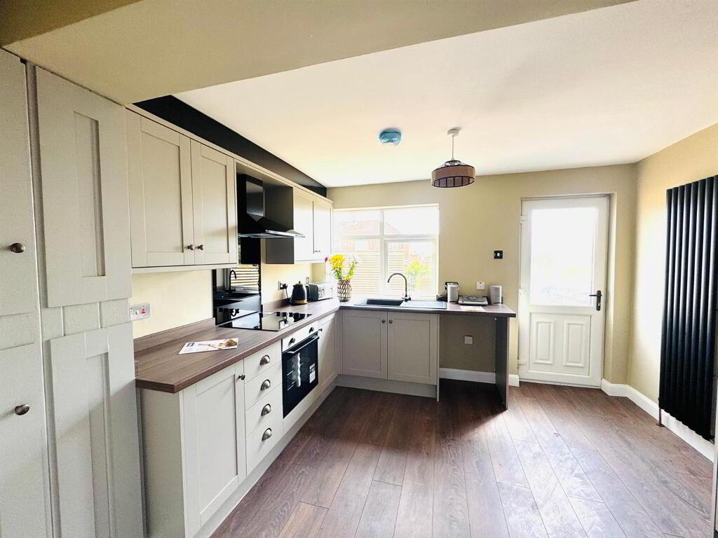 Having range of eye and low level units, single drainer stainless steel sink unit with mixer taps, hob, underoven, extractor hood, integrated fridge/freezer, breakfast bar, black wall radiator, laminated wooden floor.