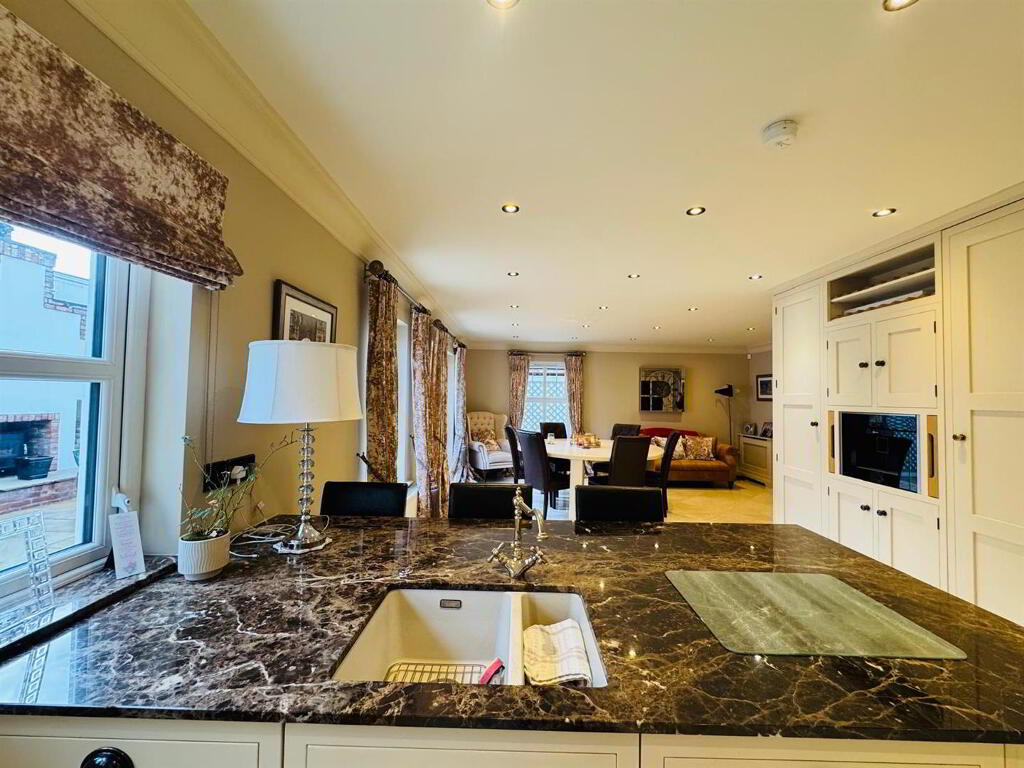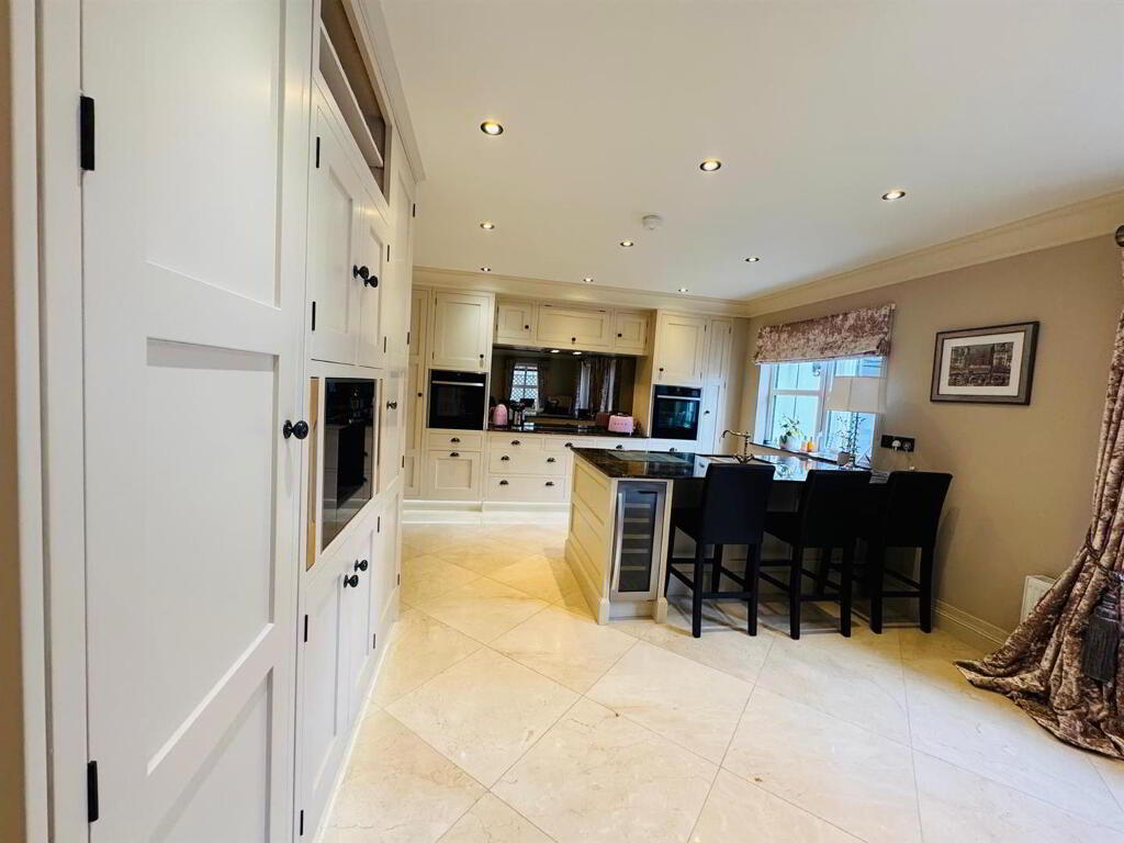 Having excellent range of eye and low level units, granite worktops, centre island with 1 1/2 bowl sink unit, integrated bins and dishwasher, wine cooler, two ovens, induction hob, extractor hood, integrated coffee machine, integrated fridge/freezer, dual aspect, ceililng cornicing, recessed lighting, ample dining space, tiled floor, French doors to rear.