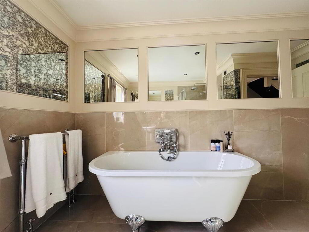 Comprising free standing bath with shower attachment to taps, walk in shower, whb and wc, feature wall mirror, recessed lighting, 1/2 tiled walls, tiled floor.