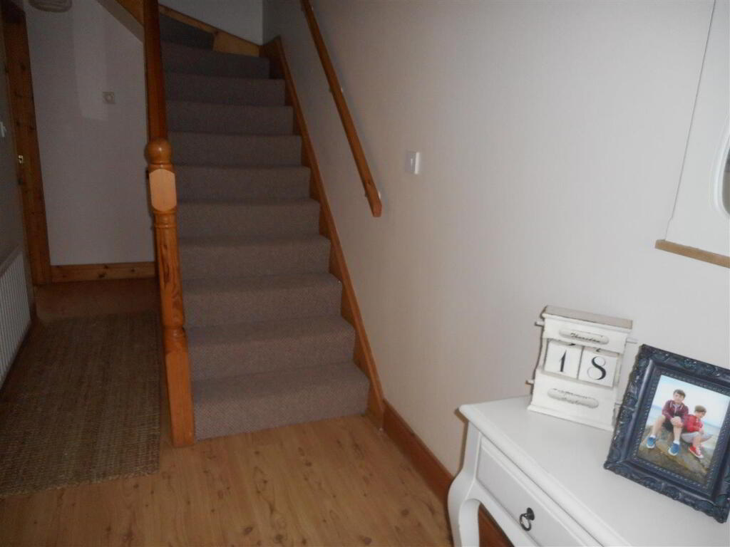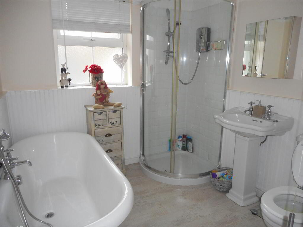 Comprising bath with shower attachment to taps, whb and wc, fully tiled walk in 'Redring' shower, half panelled walls, laminated wooden floor.