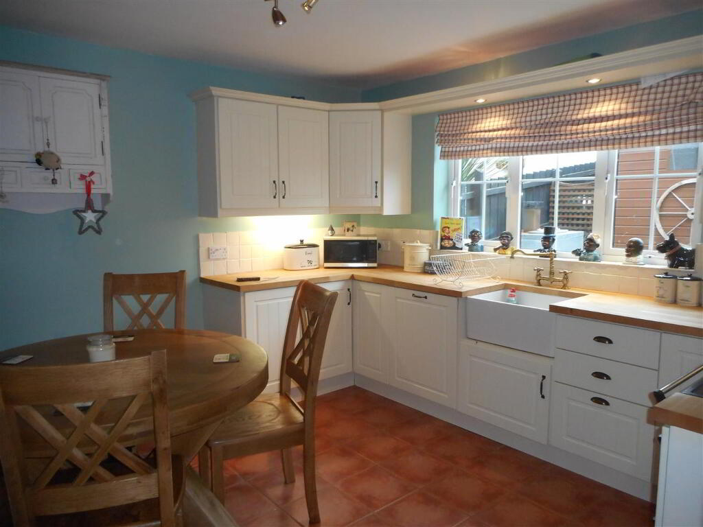 Having eye and low level units, matching window pelmet with spot light, tiling between units, 'Belfast' sink, wired for cooker, stainless steel extractor hood, tiled floor.