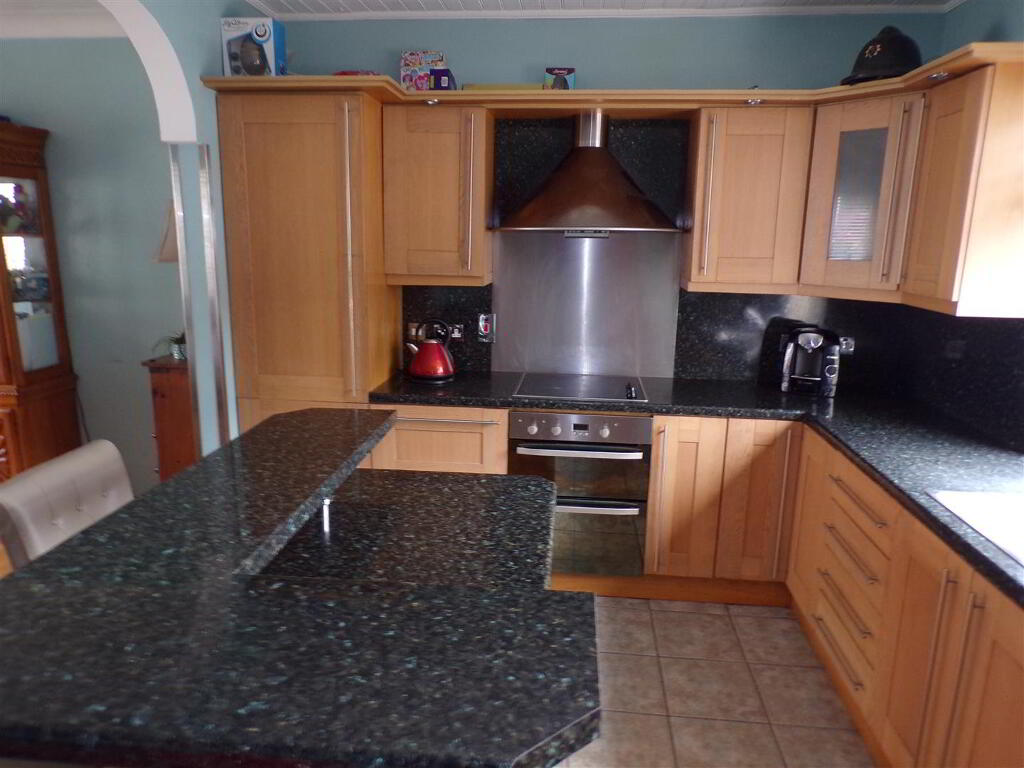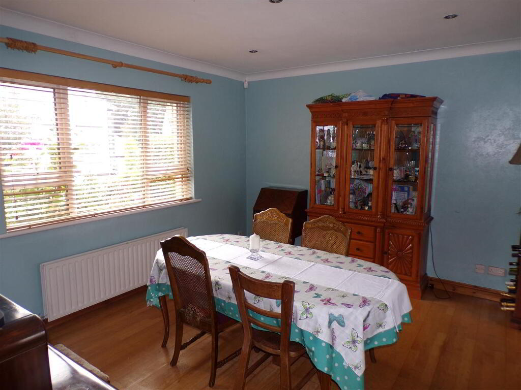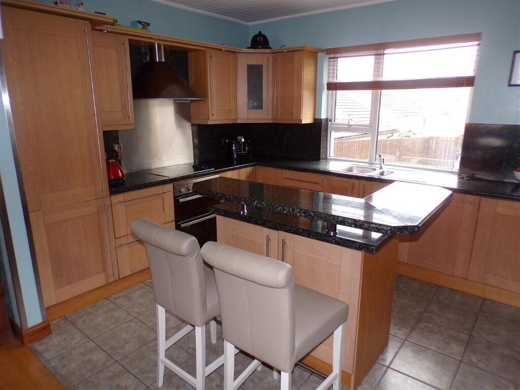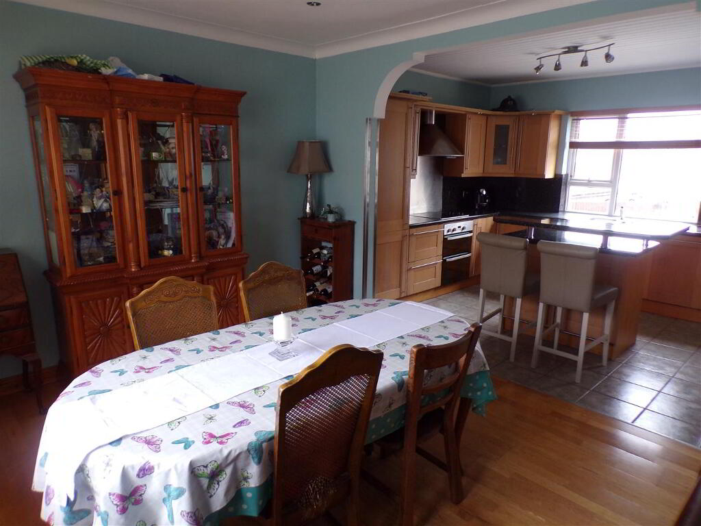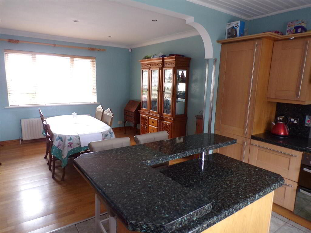 Having range of eye and low level units with pelmet lighting, 1 1/2 bowl stainless steel sink unit with mixer taps, hob, oven, stainless steel extractor canopy, integrated fridge/freezer and dishwasher, breakfast bar with storage under, tiled floor, archway to open plan dining area. Dining Area with ceiling cornicing, recessed lighting, oak laminated wooden floor.