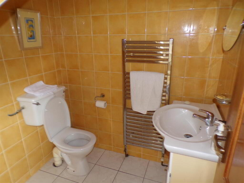 Comprising bath with electric shower over, shower screen, WHB set in vanity unit, fully tiled walls and floor