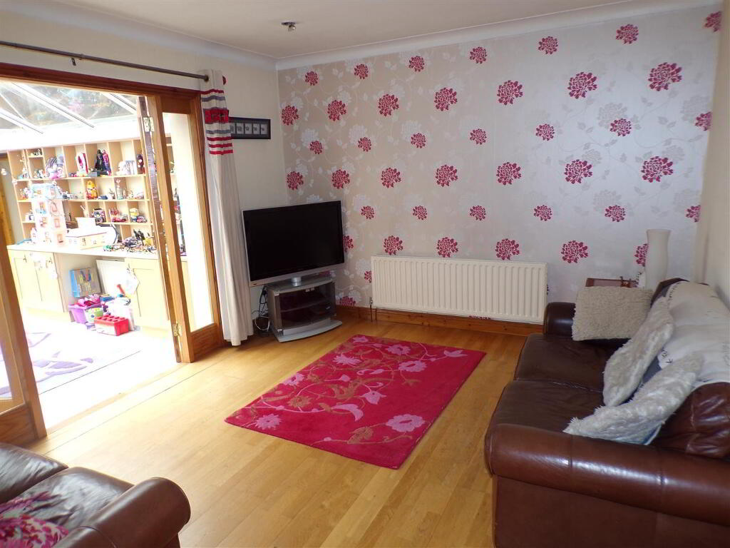 Having ceiling cornicing, recessed lighting, tiled floor and double doors to conservatory.