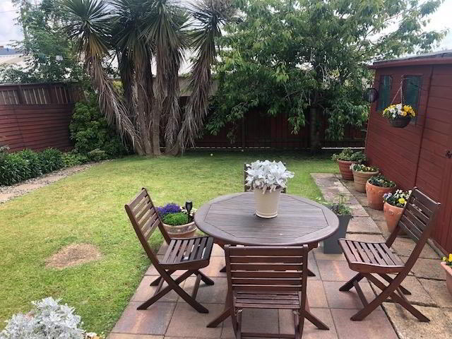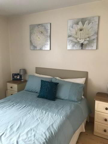 Comprising bath with hand shower to taps, walk in fully tiled shower, WHB, WC, 1/2 tiled walls, tiled floor.
