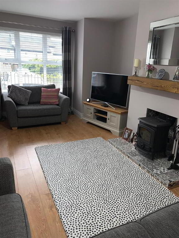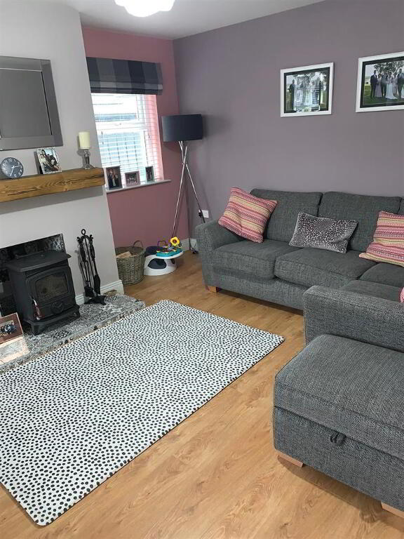 Having multi fuel stove set on tiled hearth, laminated wooden floor.