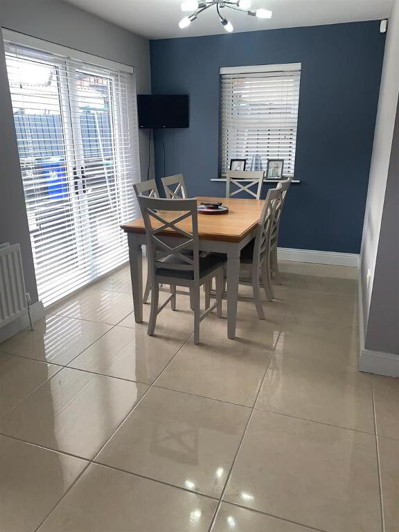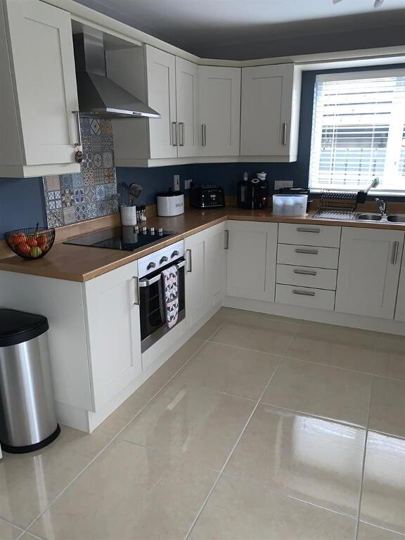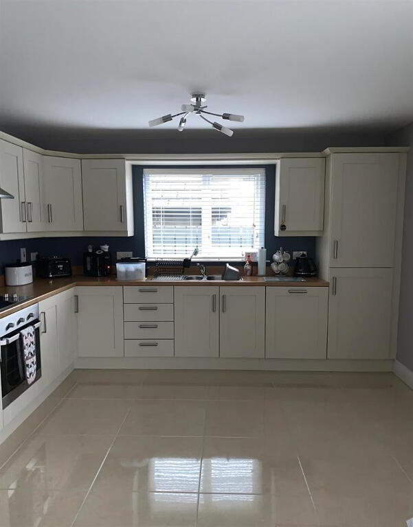 Having range of eye and low level units, matching pelmet over window, 1 1/2 bowl stainless steel sink unit with mixer taps, hob and underoven, integrated fridge / freezer and dishwasher, tiled floor, ample dining space with French doors leading to rear.