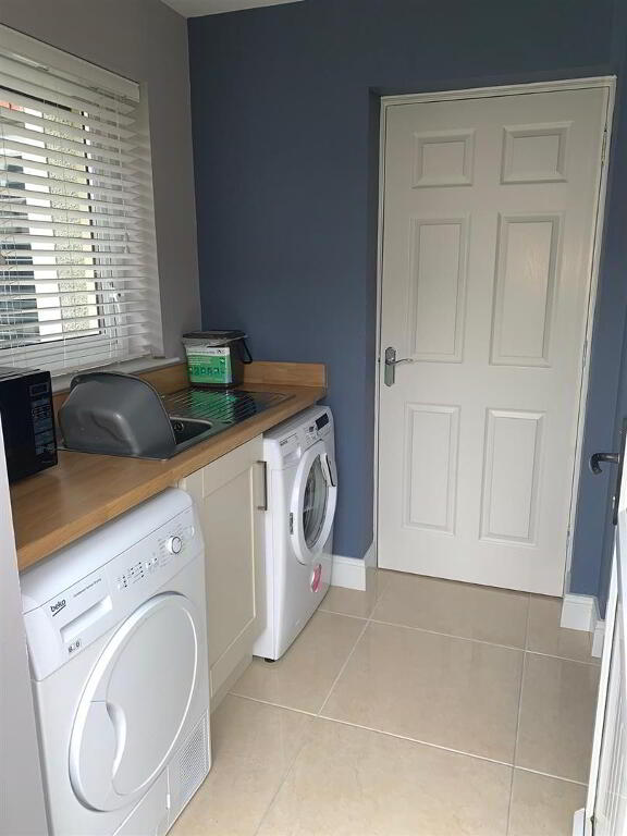 Having sink unit, space for tumble dryer, plumbed for washing machine, tiled floor.