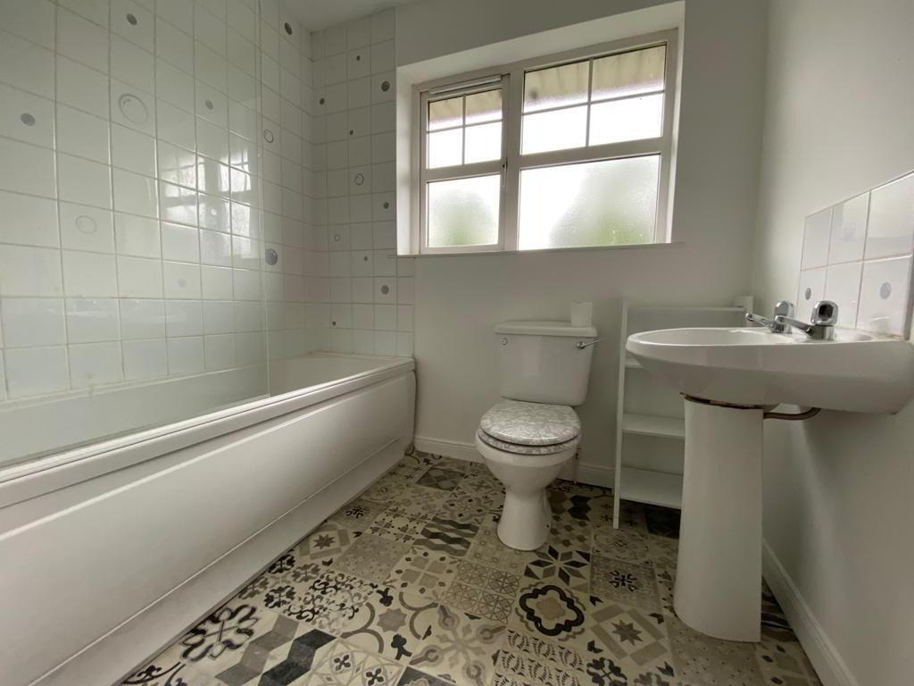Comprising bath with electric shower over and tiling around, shower screen, whb with tiling around, wc, extractor fan.