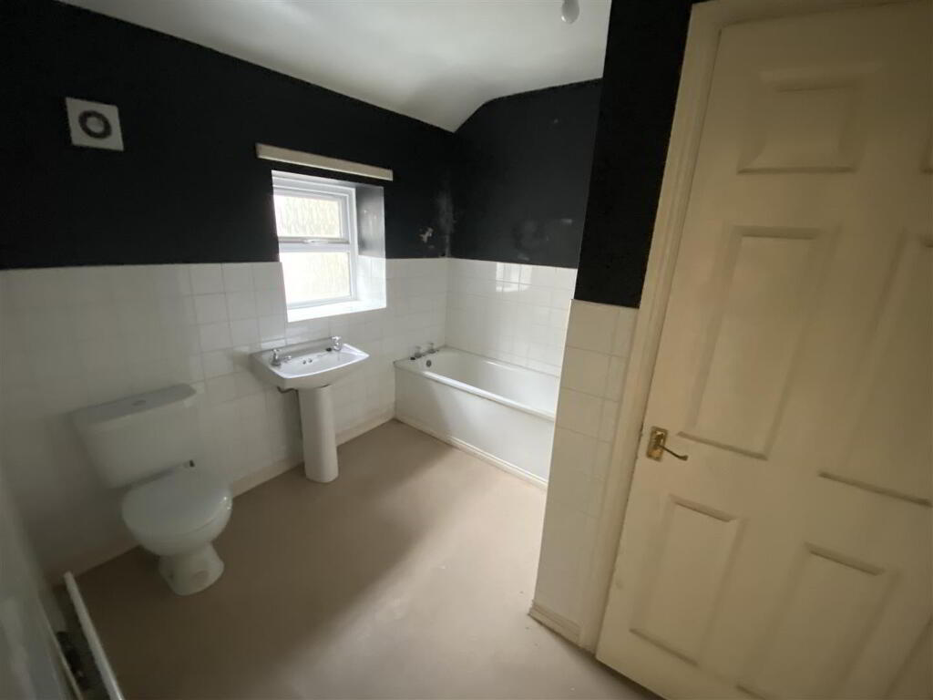 Comprising bath, whb and wc, hotpress, partly tiled walls.