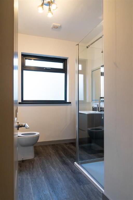 Comprising of double walk in electric shower, WHB set in vanity units, WC, heated towel rail, fitted wall mirror, extractor fan, laminated wooden floor.