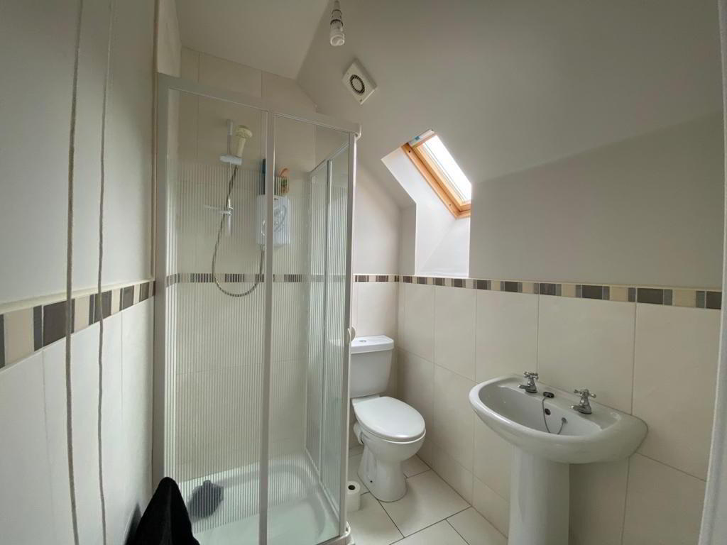 Comprising bath, whb and wc, fully tiled walk in electric shower, 1/2 tiled walls, tiled floor.