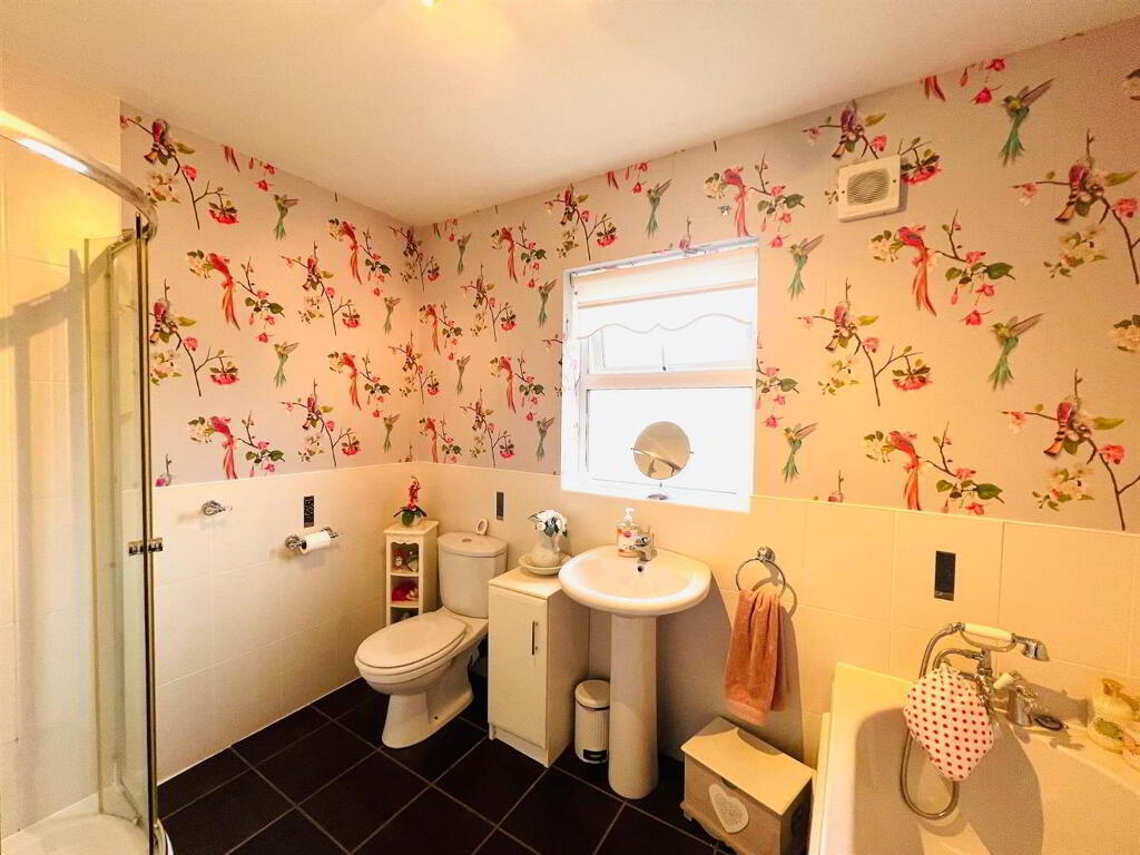 Comprising bath with telephone hand shower to taps; walk in shower; wash hand basin and WC; half tiled walls; tiled floor