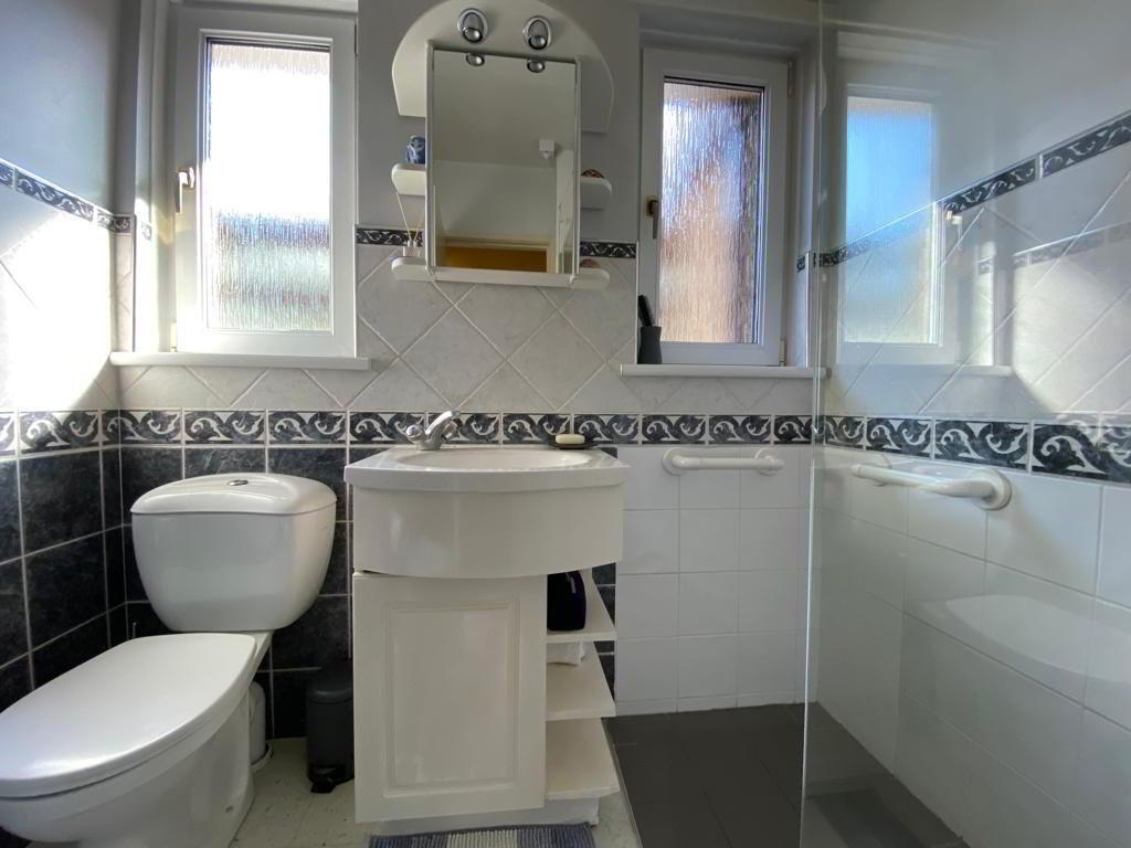 Comprising electric shower, whb with cupboard under, wc, bidet, 1/2 tiled walls, tiled floor.