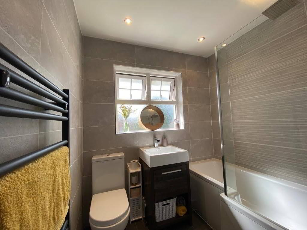 Comprising bath with shower over, shower screen, whb set in vanity unit, wc, feature wall radiator, recessed lighting, fully tiled walls and floor.