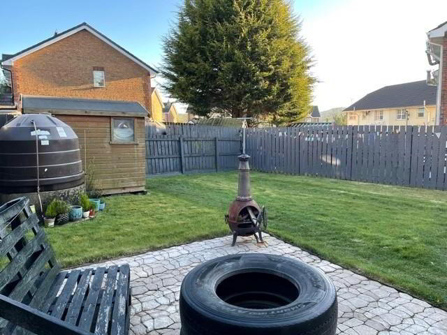 Neat lawn to front. Neat lawn to rear enclosed by fence and gate. Paved patio area. Garden shed.