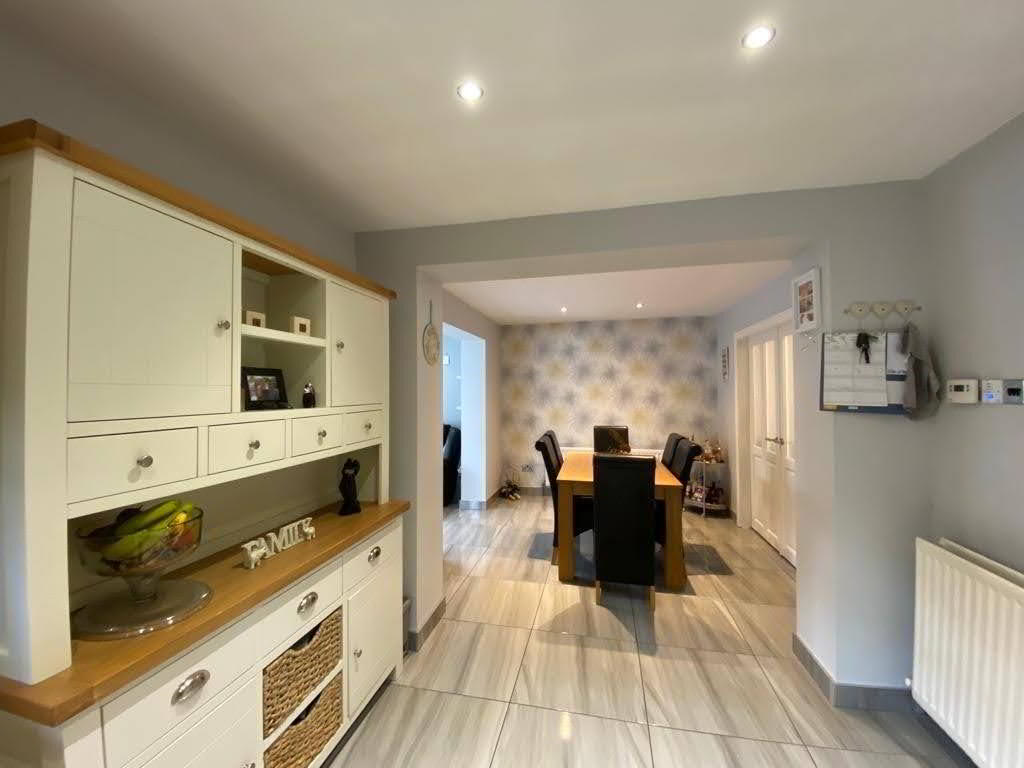 Having range or eye and low level units, tiling between units, matching pelmet over window and extractor hood, single drainer stainless steel sink unit with mixer taps, 'Belling' classic cooking centre, integrated fridge. Washing machine, dishwasher, recessed lighting, ample dining space, tiled floor. Open plan to Sunroom.