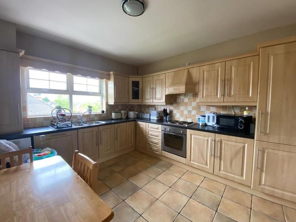 Having eye and low level units, tiling between units, 1 1/2 bowl stainless steel sink unit with mixer taps, hob, underoven, integrated fridge / freezer and dishwasher, matching extractor hood and pelmet over window, plumbed for washing machine, ample dining space, tiled floor.