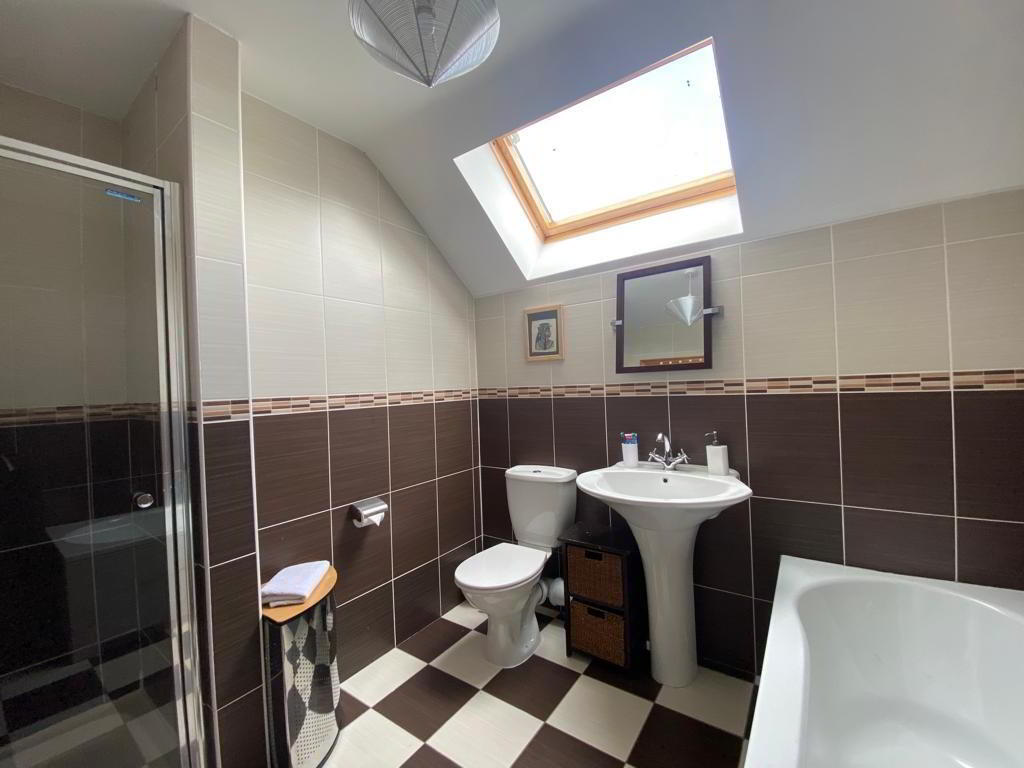 Comprising bath, fully tiled walk in shower, whb and wc, fully tiled walls and floor.
