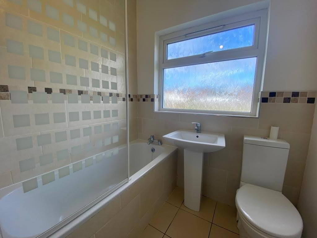 Comprising bath with electric shower over, whb and wc, hotpress, extractor fans, partly tiled walls, tiled floor.