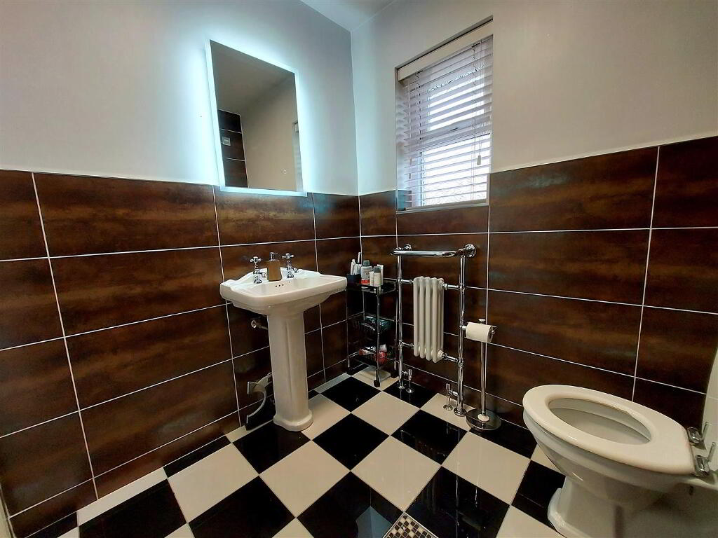 Comprising free standing bath with telephone hand shower attachment to taps, higher flush wc, whb set in vanity unit, two fully tiled walls, remaining walls panelled and mirrored with wall lights, tiled floor.