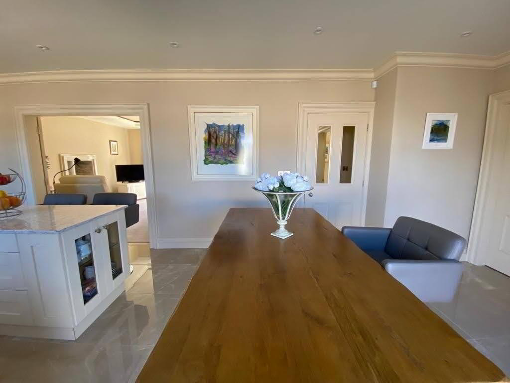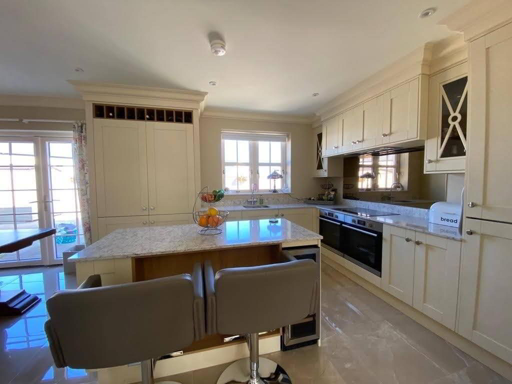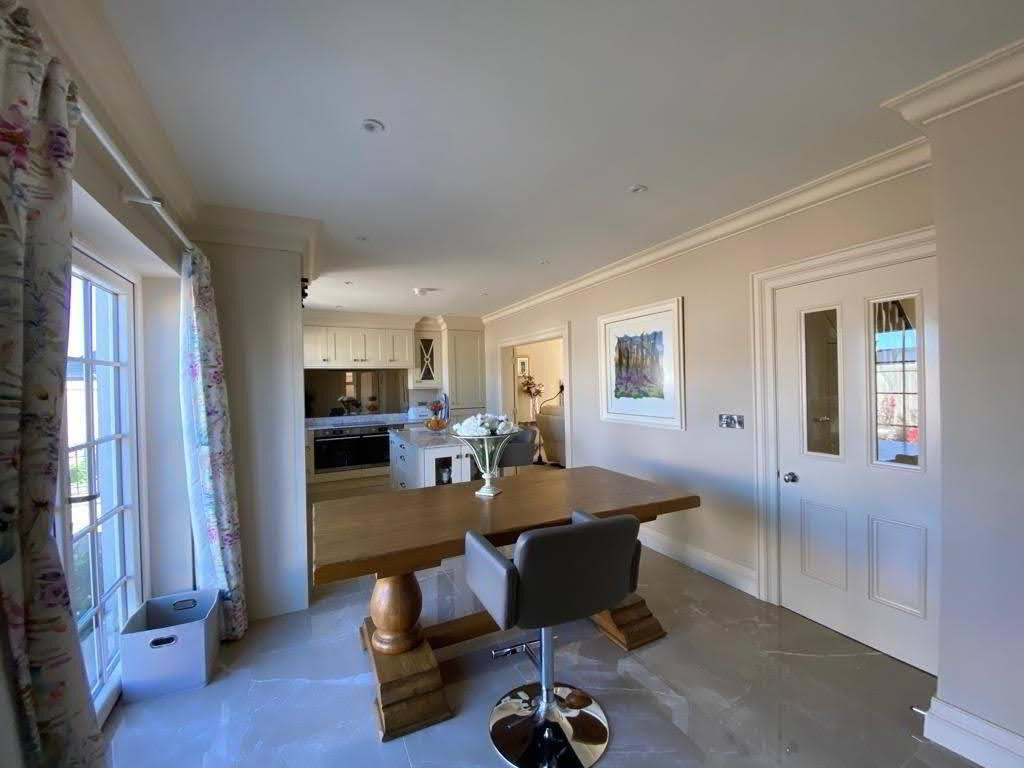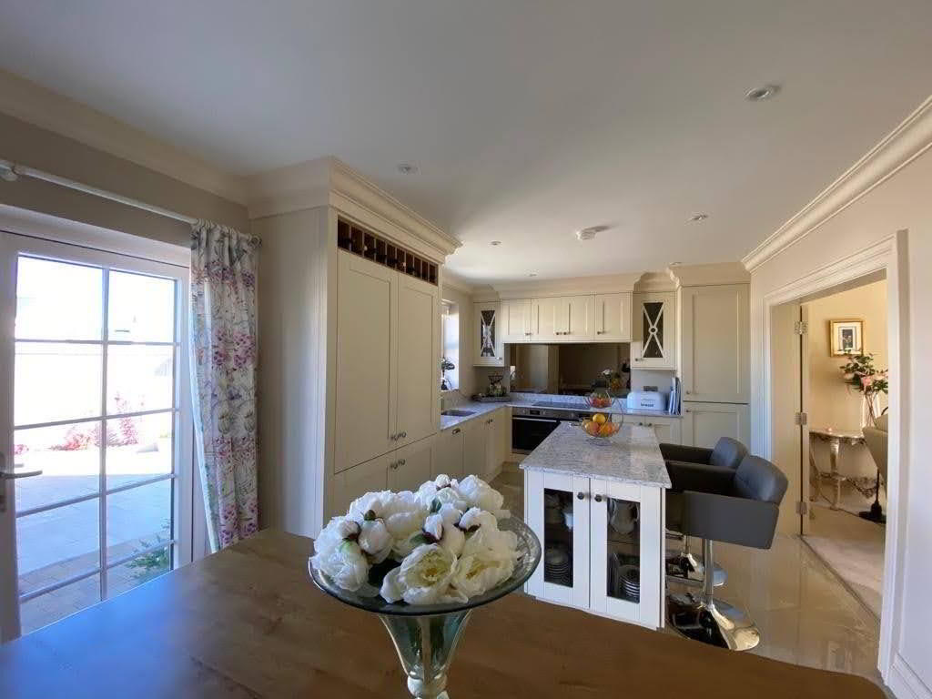 Having excellent range of eye and low level units, glazed display cupboards, 'Hotpoint' hob, 'Hotpoint' twin ovens, extractor hood, integrated fridge / freezer and dishwasher, sink set in 'Quartz' worktop with 'Frankie' boiling water tap, wine rack, larder cupboard, centre island with storage under, mirror feature splash back, ample dining space with French doors leading to rear, ceiling cornicing, recessed lighting, tiled floor.