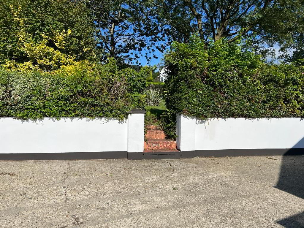 Pillars to front with double entrance gates leading to tarmac driveway. Tarmac driveway to front bordered by mature shrubs. Concrete yard to rear leading to mature lawns stocked with abundance of plants, trees and shrubs. Fence to rear.