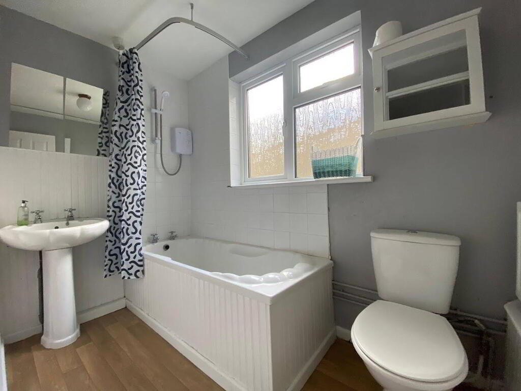 Comprising bath with electric shower over and tiling around, whb and wc partly panelled walls, extractor fan.