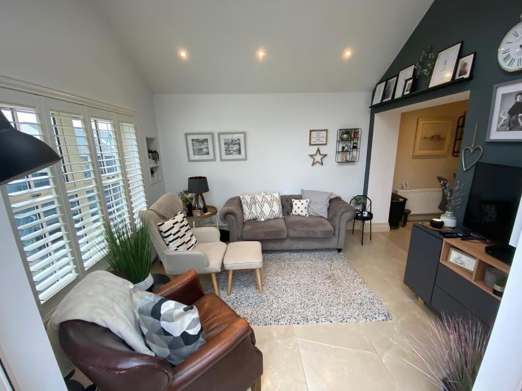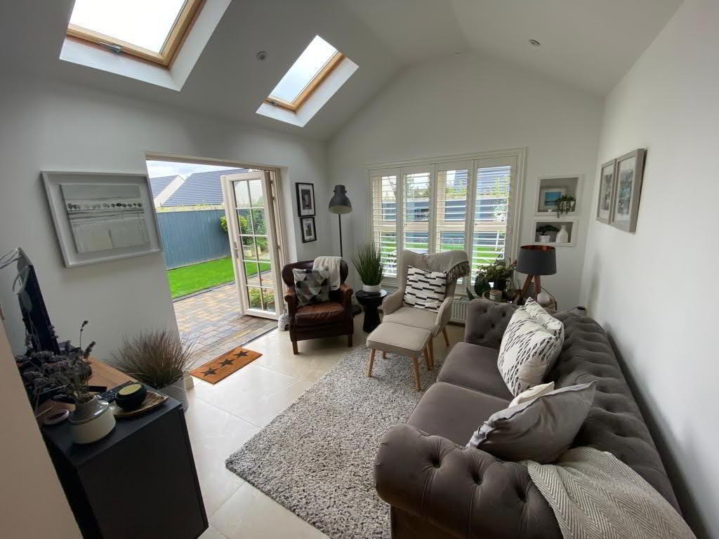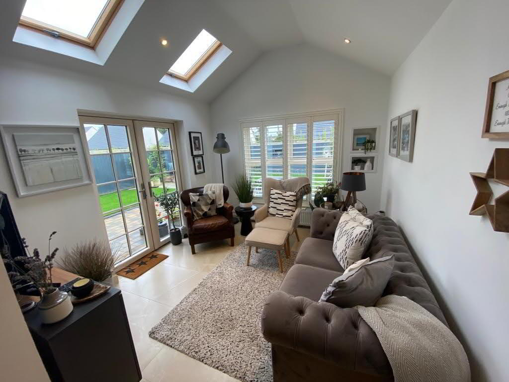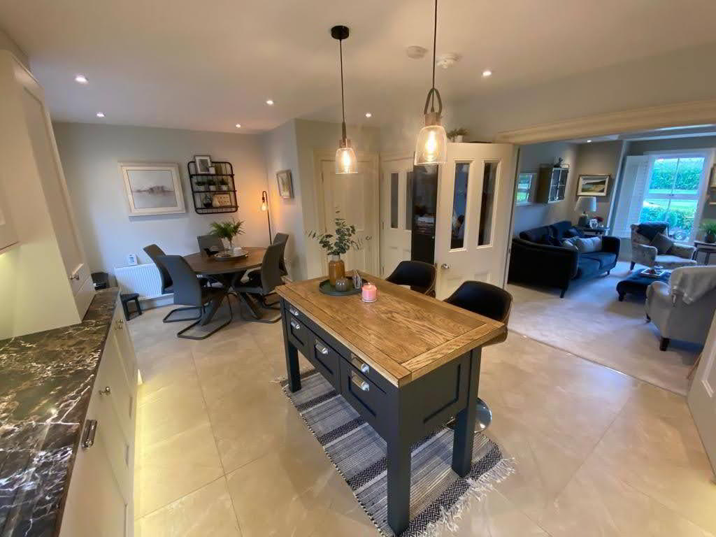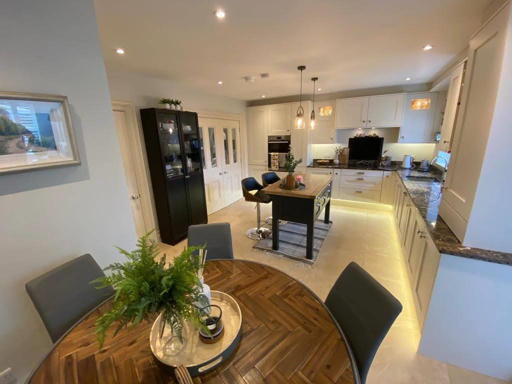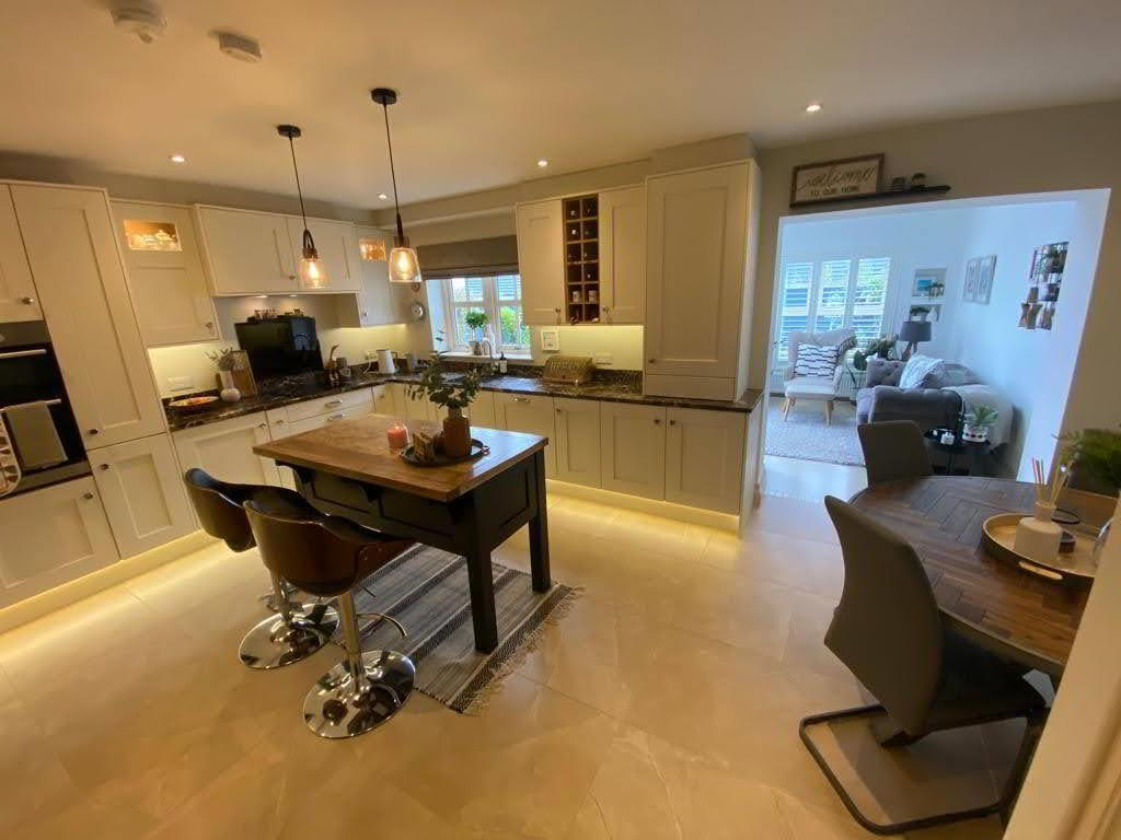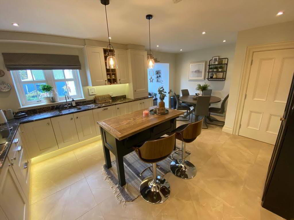 Having excellent range of eye and low level units, Belfast sink with mixer taps set in granite worktop, hob, extractor fan with light, double oven, wine rack, integrated fridge/freezer and dishwasher, recessed lighting, open plan to Sunroom, tiled floor.