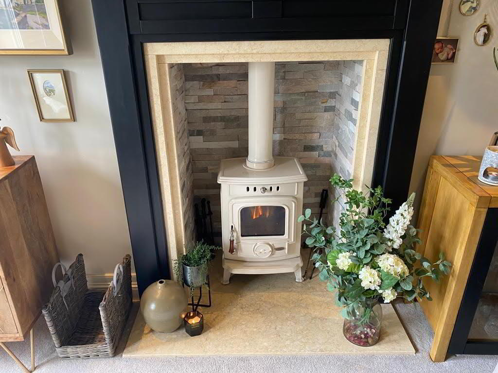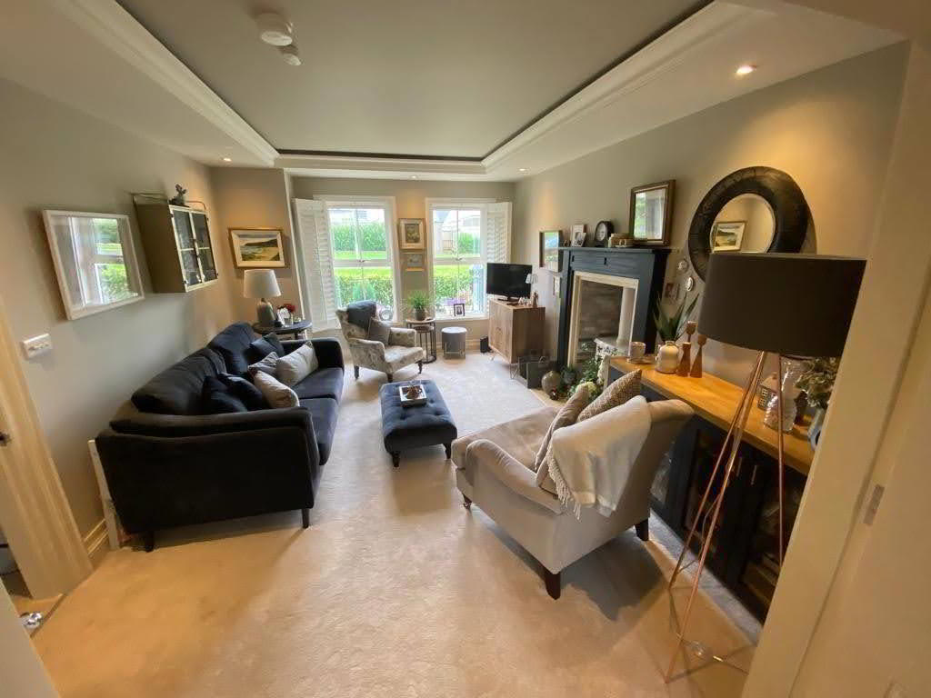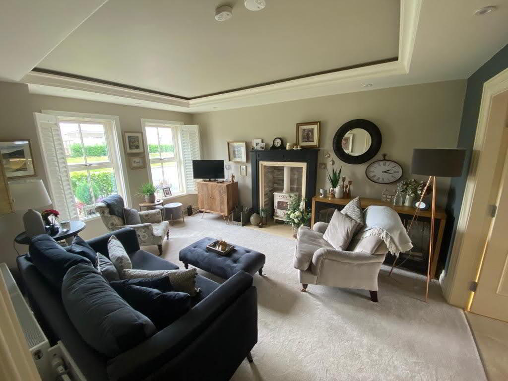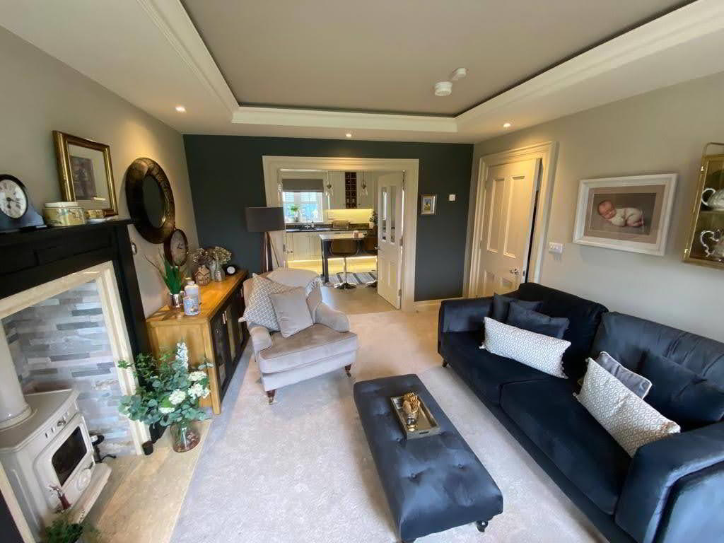 Having multi fuel stove set on marble hearth, feature ceiling with concealed lighting, double doors to Kitchen/Dining Area.