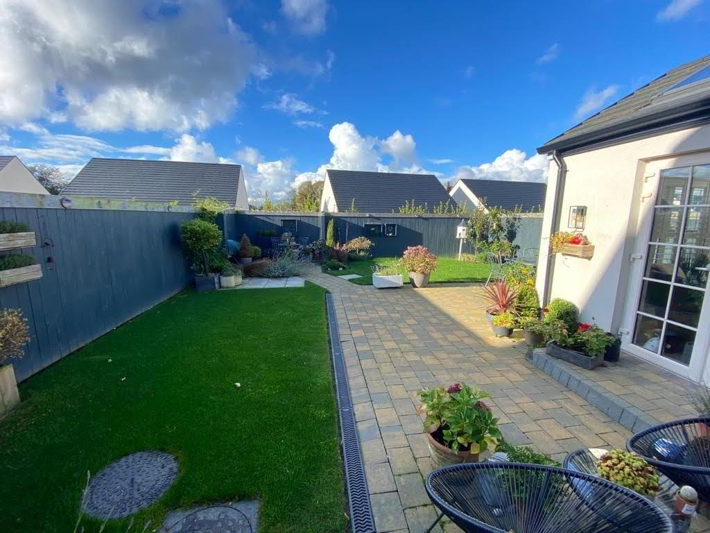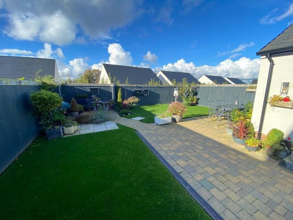 Neatly manicured lawns to front bordered by laurel hedge and cast iron pillars. Lawn to rear with fruit trees and enclosed by fence and gate. Paved patio area.