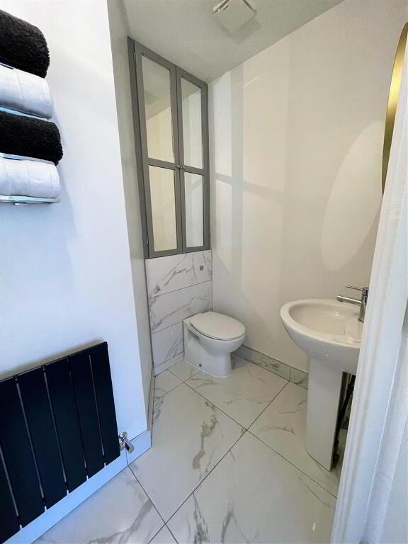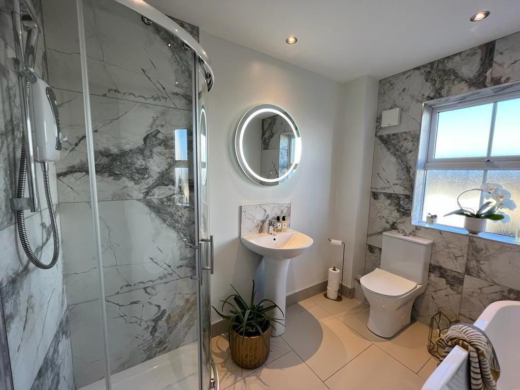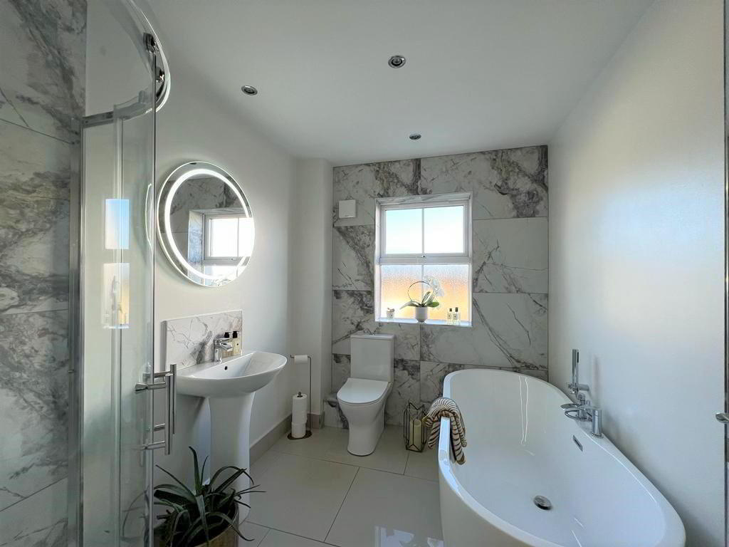Comprising bath with shower fitting to taps; fully tiled electric walk in shower; wash hand basin and WC; recessed lighting; tiled floor