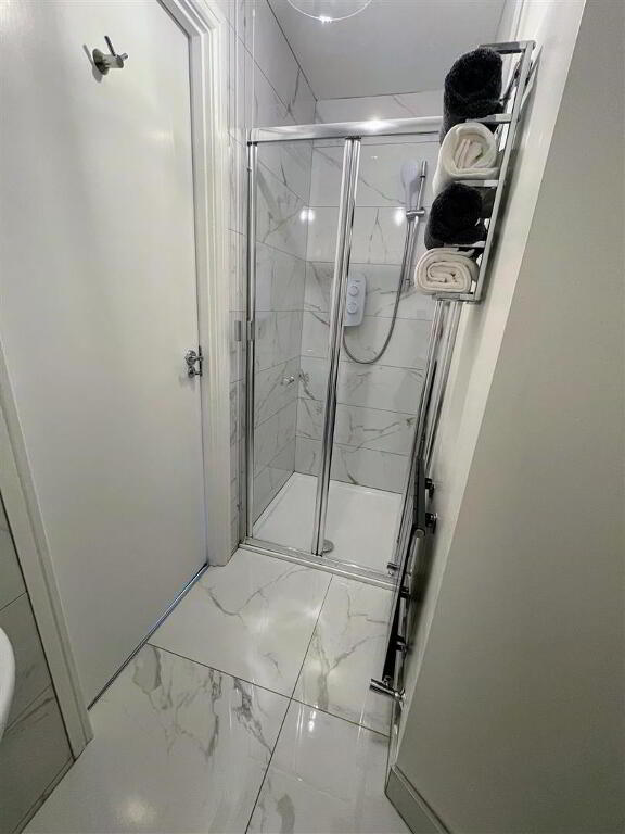 Comprising fully tiled walk in power shower; wash hand basin and WC; storage cupboard; tiled floor