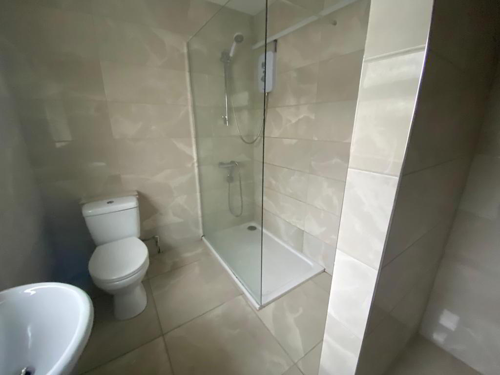 Comprising electric shower, whb and wc, extractor fan, fully tiled walls, tiled floor.