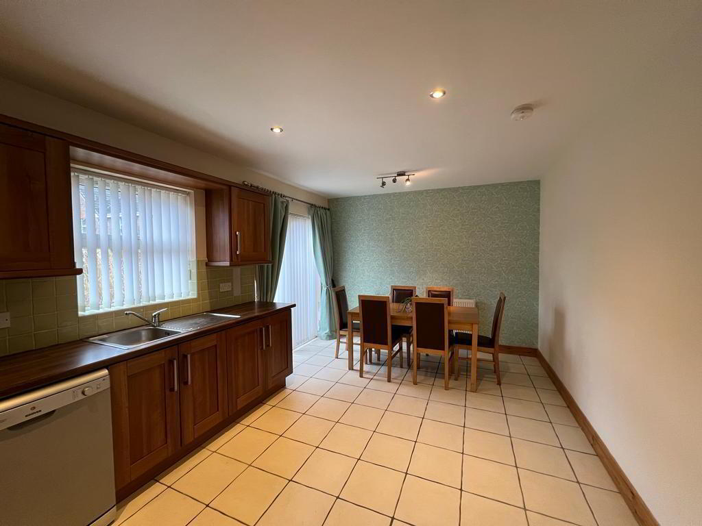 Having eye and low level units, tiling between units, single drainer stainless steel sink unit with mixer taps, hob, underoven, stainless steel extractor hood, plumbed for dishwasher, ample dining space with patio doors, tiled floor.