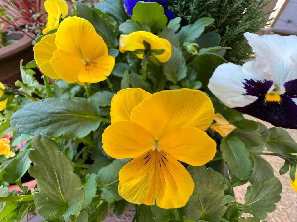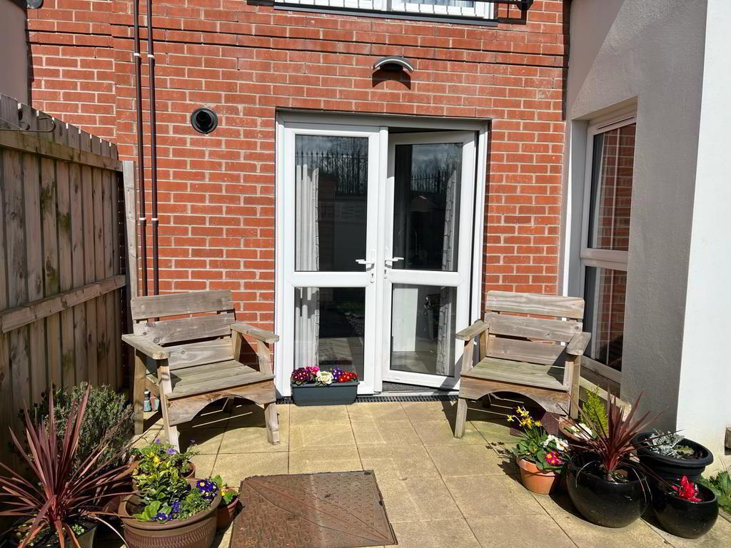 Paved patio area leading to lawn with raised flower bed. Lawn bordered by wall, fence and gate.