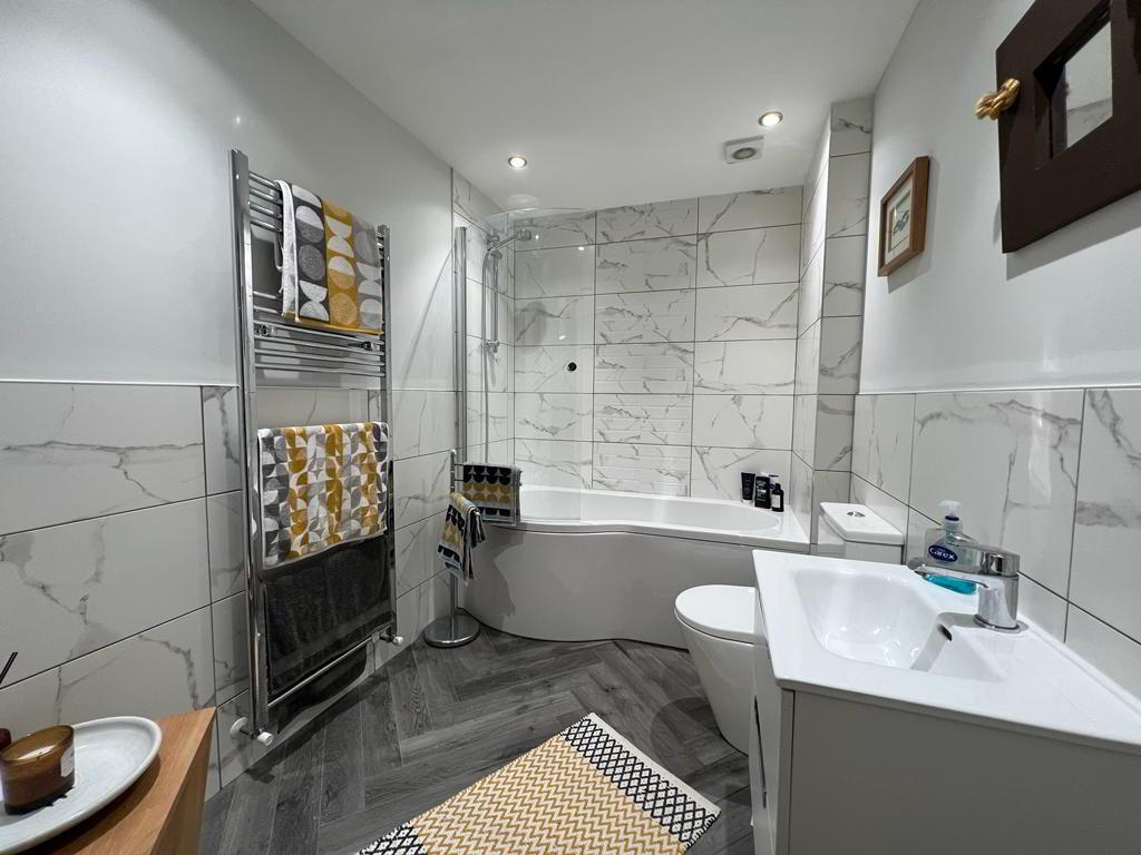 Comprising bath with shower fitting to taps, shower screen, whb set in vanity unit, wc, chrome radiator, recessed lighting, wooden floor.
