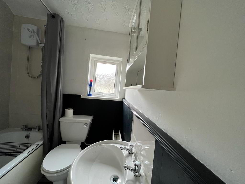 Comprising bath with electric shower over and tiling around, whb and wc, part wooden panelled walls.