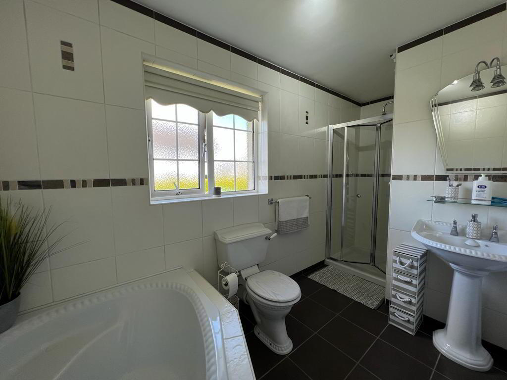 Comprising corner bath with telephone hand shower attachment to taps, whb and wc, walk in shower, fully tiled walls and floor.