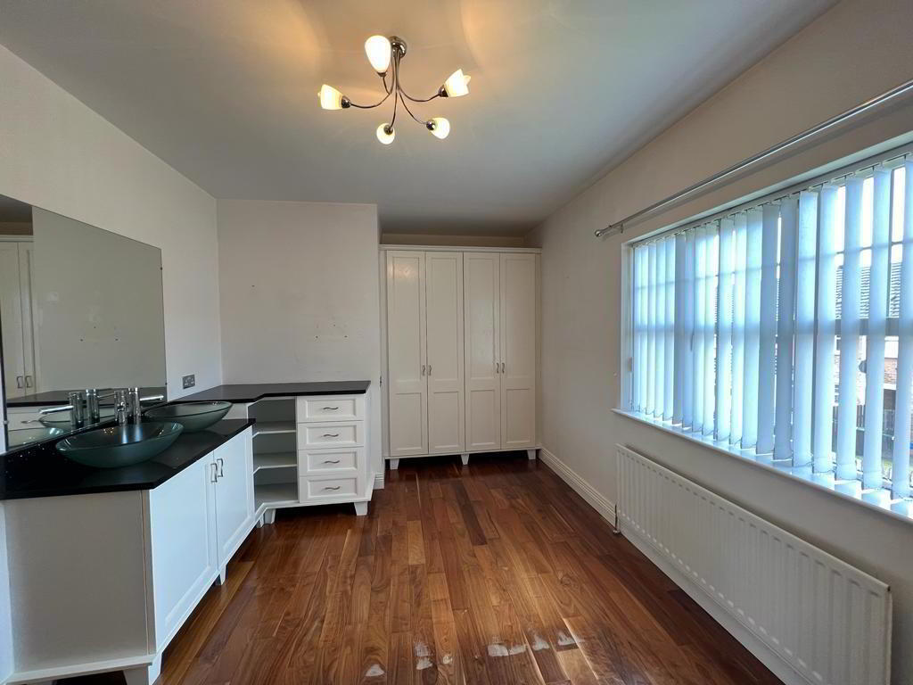 Having his and hers wash hand basin set in vanity unit with additional storage. Range of built in wardrobes and lockers, wooden floor.