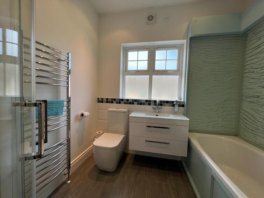 Comprising bath with shower fitting to taps,fully tiled walk in electric shower, whb set in vanity unit, wc, feature glass wall with feature lighting, chrome radiator, tiled floor.