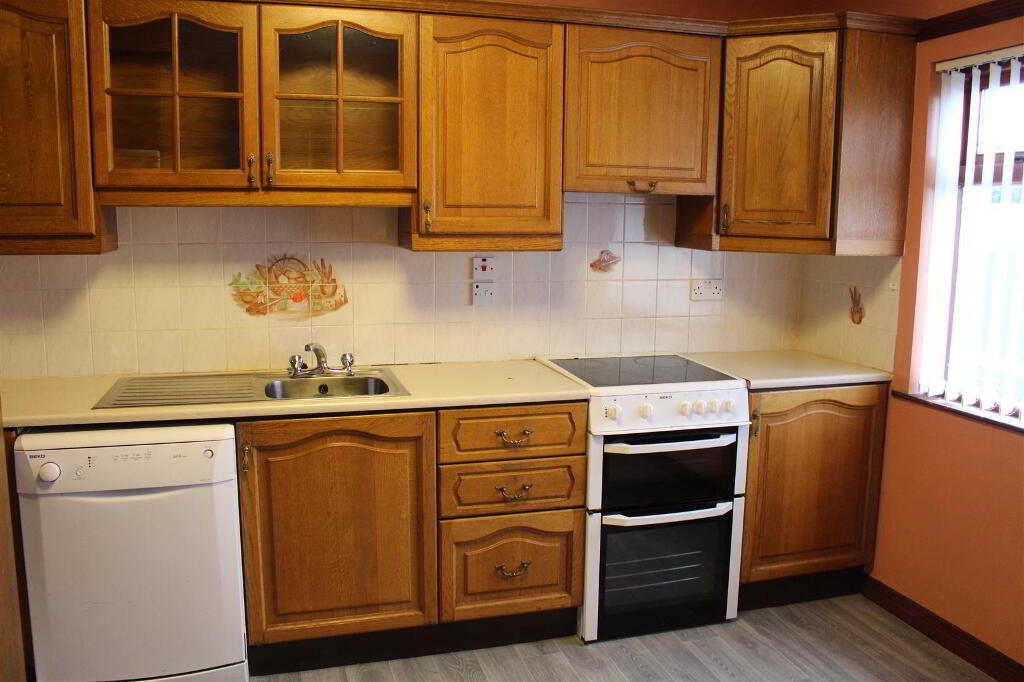 with eye and low level units, matching worktop, plumbed for automatic washing machine, feature glass display unit, cushion flooring.