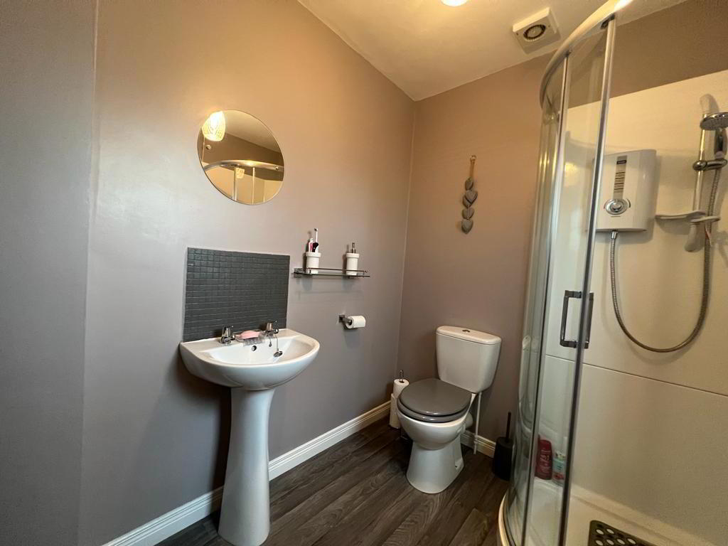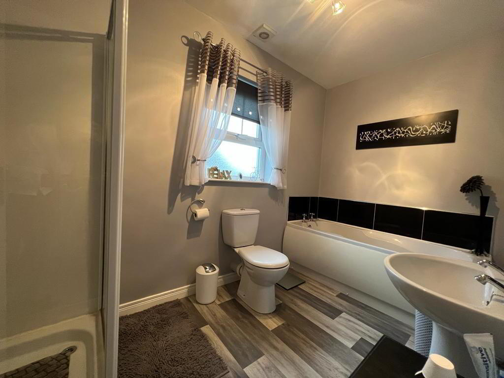 Comprising bath, whb and wc, walk in shower with PVC cladding to walls.