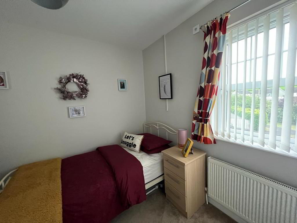 Neat lawns to front, side and rear bordered by fence and gate. Tarmac driveway.