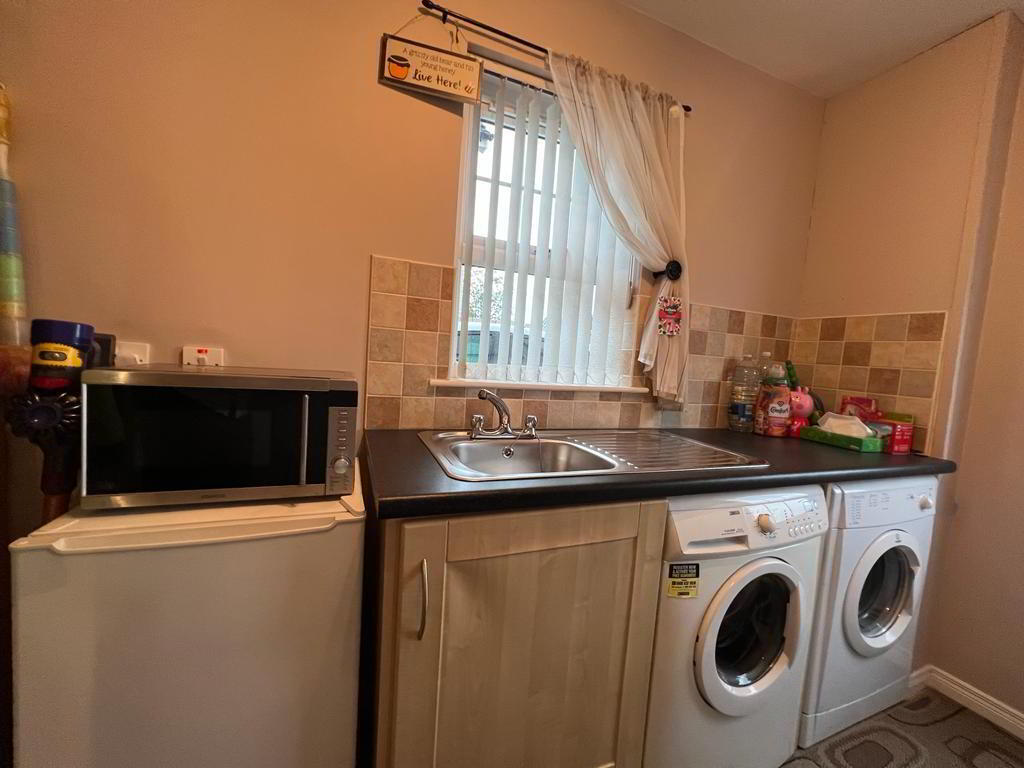 Having sink unit, plumbed for washing machine, space for tumble dryer, tiled floor.