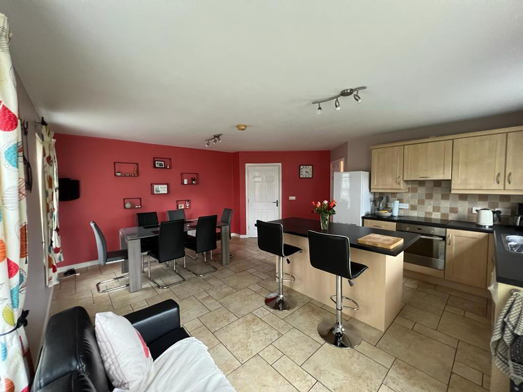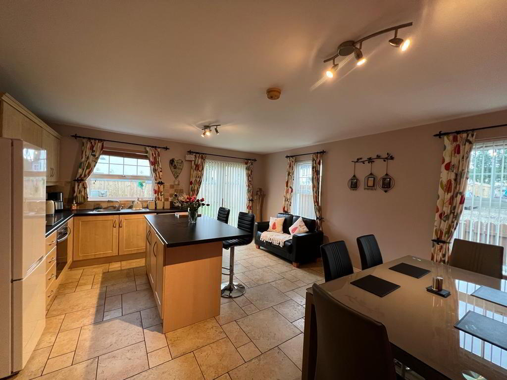 Having range of eye and low level units, tiling between units, single drainer stainless steel sink unit with mixer taps, extractor hood, plumbed for dishwasher, centre island with storage, ample dining space, tiled floor, French doors leading to rear.